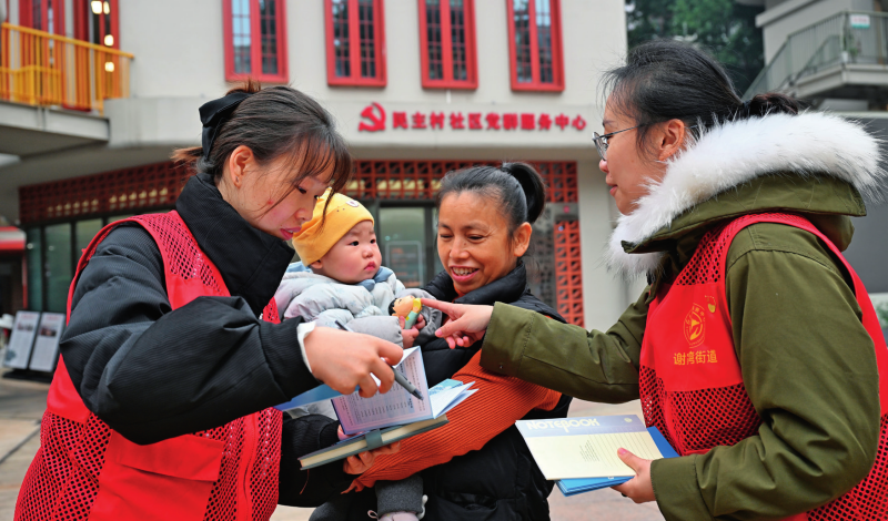 重庆市九龙坡区谢家湾街道民主村社区工作人员陈春林(左一)、廖睿(右一)向辖区群众讲解城乡居民基本医疗保险政策(2025 年 12 月 9 日摄) 陈诚摄 / 本刊