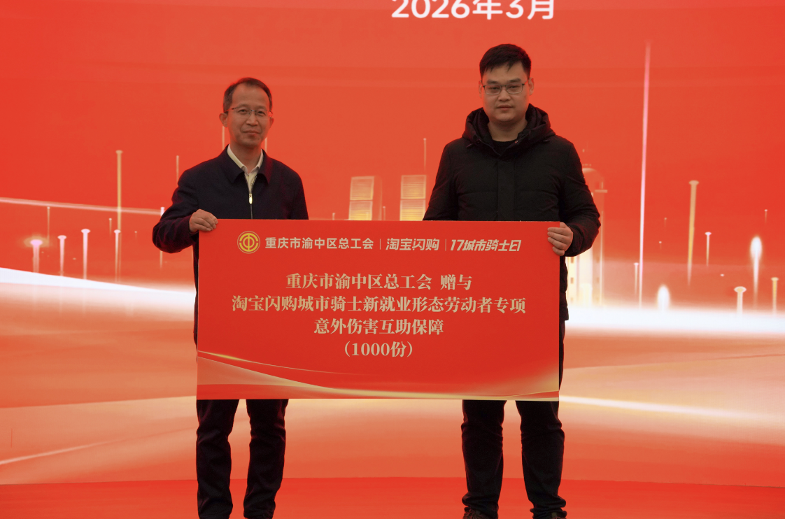 活动中,中国财贸轻纺工会相关负责人为集中入会的淘宝闪购骑手代表颁赠了渝中区总工会为入会骑手购买的专项意外伤害互助保险。重庆市总工会对广大外卖骑手为城市运行、民生保障作出的积极贡献给予充分肯定。