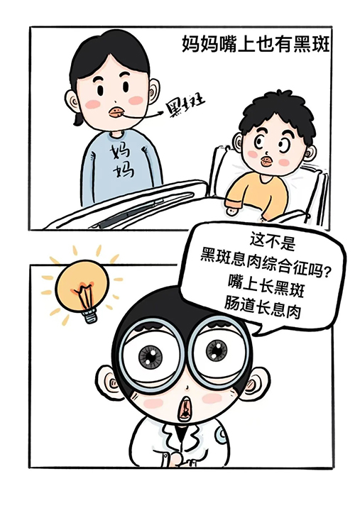 上个月一次常规查房,他无意间注意到患者童童(化名)嘴唇上有黑斑,心里瞬间“咯噔”一下。这个症状,和他正在创作的科普漫画“黑斑息肉综合征”的表现一模一样。这是一种罕见遗传病,患者胃肠道里的息肉癌变风险很高。他观察询问得知,童童的母亲也患有这种病,还多次得过肠套叠。幸亏这次发现得早,童童只要定期回医院复查随访就行。