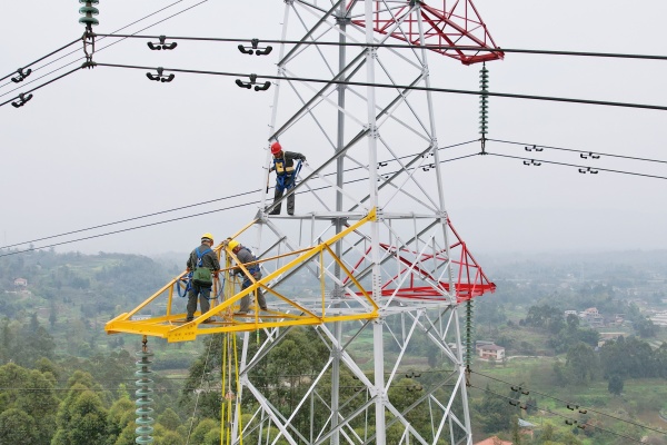 近日,在铜梁区南城街道梯子村,国网重庆铜梁供电公司输电运检班作业人员登上220千伏全龙南北线28号塔,有序开展绝缘子更换作业。这是该公司首次自主实施220千伏线路检修工作。